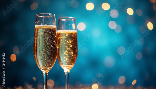 Happy New Year - Champagne Toast Celebration - Goblets With Golden Glittering On Blue Abstract Background With Defocused Bokeh Lights
