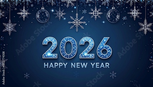 2026, happy new year, new year, new year's eve, winter, snowflake, celebration, festive, blue, background, sparkling, elegant, holiday, greeting, card, banner, poster, invitation, shiny, glistering, magic, light, glow, ornament, bauble, garland, season, jan, event, party, joyous, cold, frost, crystal, white, silver, template, design, decorative, midnight, countdown, future, welcome, wishes, starry, bokeh, dark blue, december