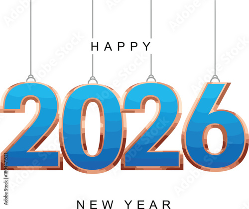 Happy New Year 2026 Vector Design with Hanging Blue and Copper Metallic Numbers, Perfect for Festive Banners, Corporate Greetings, and Modern Celebration Cards