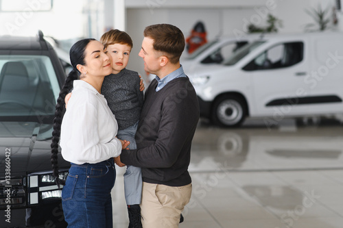 Happy parents with small kid after receiving keys for their new car in a showroom. Congratulations, we have a deal about buying a car! Happy family came to an agreement with a car salesperson
