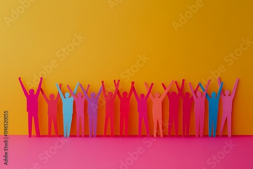 man, silhouette, profile, people, crowd, colourful, paper, figure, cut-out, celebration, joy, oneness, togetherness, community, teamwork, collaboration, group, diversity, inclusion, equality, optimism, hope, uplifting, positive, vibrant, bright, happy, cheerful, energetic, passionate, powerful, strong, solidarity, achievement, success, background, orange, pink, minimal, simple, concept, illustration, design, art