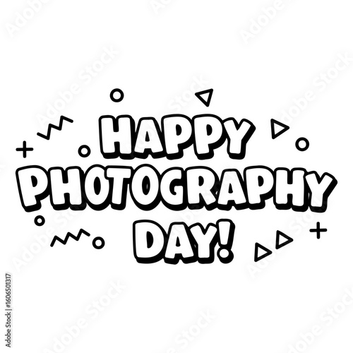 Happy Photography Day graphic design in a stylized font with graphic elements. Celebrating the day with a bold, cartoonish text effect and an artistic background of geometric shapes.