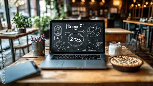 pi, day, 2025, celebration, cafes, laptop, screen, drawing, mathematic, study, education, learning, hot drink, table, wooden, workspace, work, business, technology, digital, graphic, design, illustration, mathematic, geometry, pie, dessert, food, drink, milk, cup, stationary, supply, office, modern, interior, productive, focused, happy, mathematic