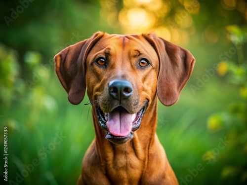 Happy Rhodesian Ridgeback Dog Close-Up Portrait, Green Nature Background