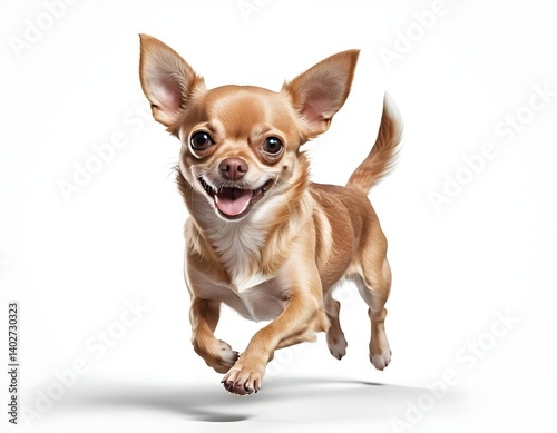 chihuahua, dog, puppy, small dog, running, jumping, happy, playful, pet, canino, animal, mammal, adorable, cute, brown, tan, white, paw, fur, tail, energetic, cheerful, lively, movement, motion, speed, white background, isolated, portrait
