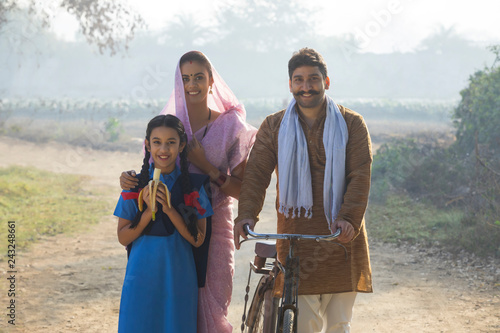 Happy rural family consisting of man, woman and a school going girl walking on pathway in a village.