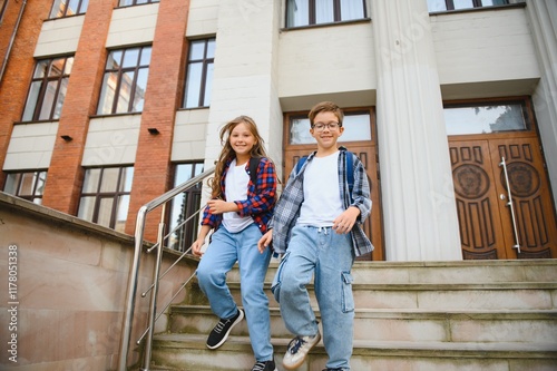 Happy school kids friends boy and girl with backpacks walking and laughing having fun together near school building outside outdoor after lessons