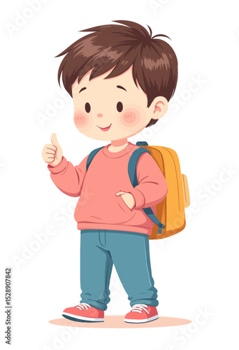 boy, backpack, school, student, children, happy, young, smile, education, learning, youth, casual attire, red shoes, pink sweater, brown hair, thumb up, ready, positive, cheerful