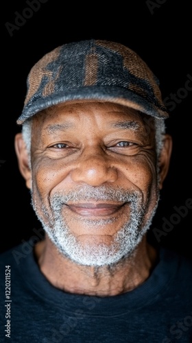 senior, man, portrait, black, african american, elderly, happy, smiling, face, closeup, cap, hat, grey hair, beard, goatee, expression, emotion, contentment, satisfaction, aged, mature, wise, experienced, thoughtful, kind, genuine, friendly, human, people, person, individual, lifestyle, photo