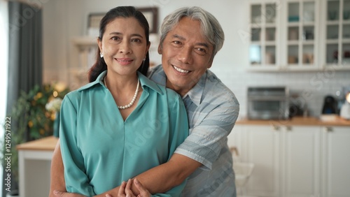 Happy senior couple with casual cloth spending time together and hugging at modern kitchen. Grandmother and grandfather holding hand together and looking at camera. Healthy relationship. Myrmidon.