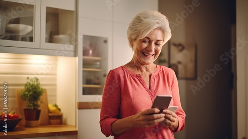 Happy senior female holding smartphone using mobile phone app. Technology, communication, happy adult woman with smartphone at home, recreation, communication, sociality, hobbies, adaptation, AI gen