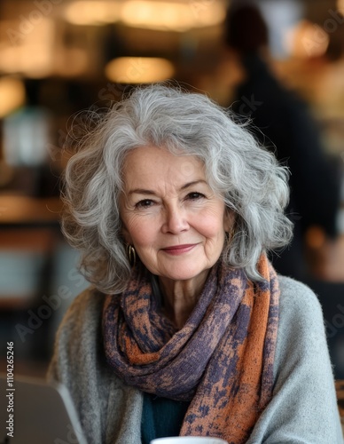 laptop, cafes, working, smiling, happy, freelance, hot drink, technology, elderly, businesswoman, entrepreneur, grey hair, mature woman, confident, independent, connection, wireless, cyberspace, casual attire, cosy, urban, lifestyle, window, indoor, daytime, communication, one person, vertical