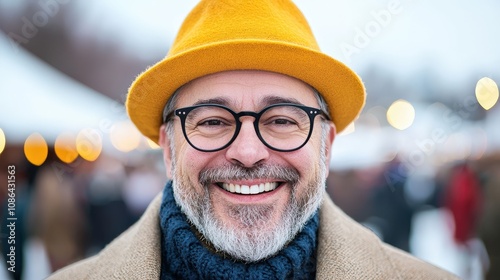 man, senior, happy, smiling, portrait, winter, city, urban, eyeglass, hat, yellow, jacket, coat, outdoors, background, bokeh, light, cheerful, joyful, positive, expression, face, beard, grey hair, middle-aged, adult, people, person, human, lifestyle, fashion, style, emotion, feeling