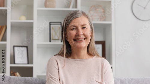 Happy senior woman sitting on sofa in nice apartment. A grayhaired grandmother in her 50s or 60s is resting on the couch at home, smiling.