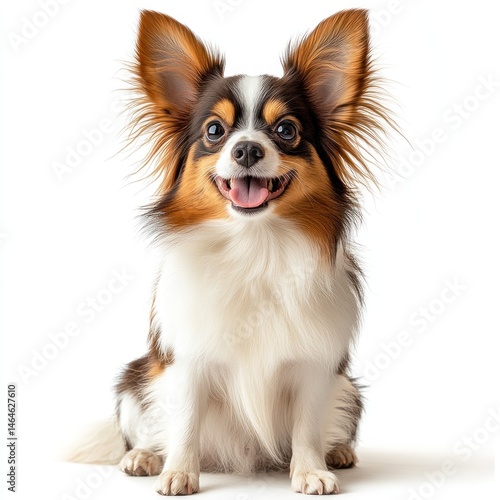Happy small dog with fluffy ears and bright eyes sitting joyfully against a white background, exuding warmth and friendliness