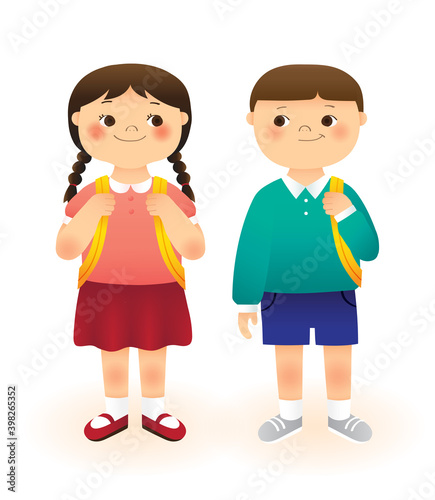 children, cartoon, children, boy, people, children, happy, illustration, cute, children, family, school, friendship, smile, friends, drawing, kindergarten, fun, girl, group, young, love, hand, holding, playing, backpack, friendly, elementary school, elementary school, back to school, twin, together, male, female, childhood, education, bag, pink shirt, green shirt, white background, red skirt