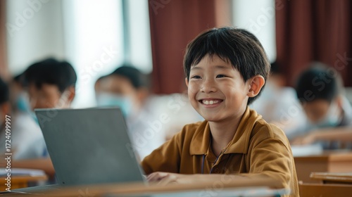 happy smiling asian school boy using laptop computer at class in classroom smiling chinese junior school student learning online virtual education digital program app technology during tech lesson no