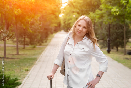 Happy smiling blonde woman 30s or 40s years with suitcase and backpack goes on vacation, travel, outdoor on green summer alley