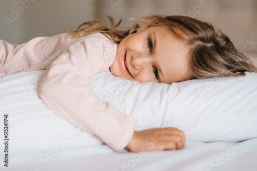 Happy smiling child girl lying on the bed on white fluffy pillow good morning enjoy new day