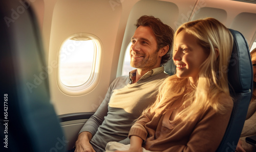 Happy smiling couple is flying in an airplane in first class, travel relax and recharge