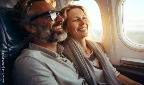 Happy smiling couple is flying in an airplane, travel relax and recharge.