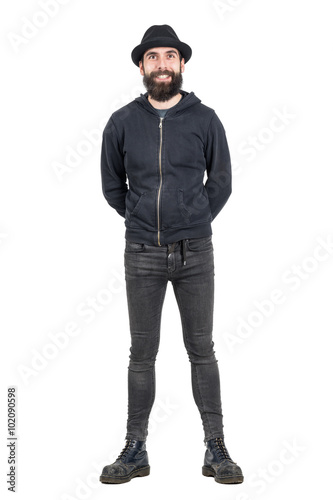 hat, fedora, man, beard, stylish, retro, male, hipster, black, smiling, laughing, alternative, subculture, youth, culture, fashion, clothes, modern, toothy smile, happy, piercing, smiley, pierce, isolated, full body, full-length, white background, standing, old, people, young, lifestyle, cool, dirty, friendly, worn, leather, full, slim, guy, jean, punk, boot, army, length, tight, sweatshirt, hoodie, punk rock