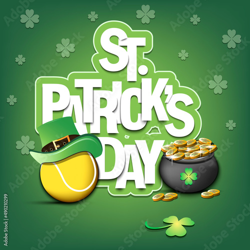Happy St. Patrick's day. Tennis ball in leprechaun hat, pot with gold coins and clover. Pattern design for logo, banner, poster, greeting card. Vector illustration on isolated background