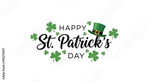 Happy St. Patrick's Day typography with a festive green leprechaun hat and lucky shamrocks, perfect for greetings.
