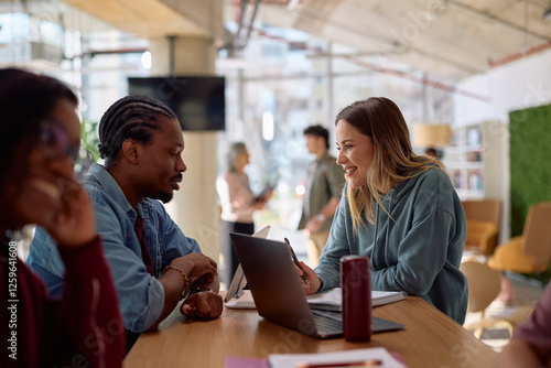 Happy students talking while studying together at university.