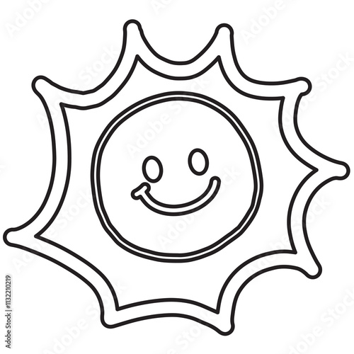 Happy sun outline for spring, summer break, hot season, warm temperature, weather, picnic, cartoon character, comic, cute patch, shirt print, brooch, emoji, sticker, kid colouring book, art, painting