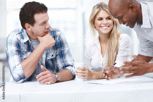 happy, team, creative, business, office, meeting, thinking, planning, collaboration, startup, businessperson, paper, paperwork, discussion, project, brainstorming, strategy, idea, copywriter, woman, man, young, hot drink, together, design, talking, reading, men at work, training, professional, job, learning, manager, employee, company, entrepreneur, help, conversation, diversity, workplace, workshop, communication, staff, consulting, career, agency, research, development