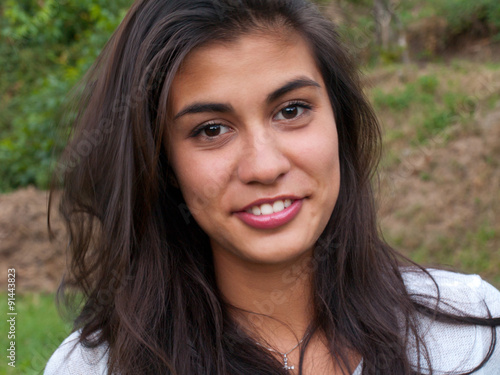 girl, smiling, teenage, smile, face, long hair, brown skin, european, asian, mixture, expression, teeth, happy, facial expression, gesture, head, eye, mouth, lip, emotion, facial, fun, communication, body language, tree