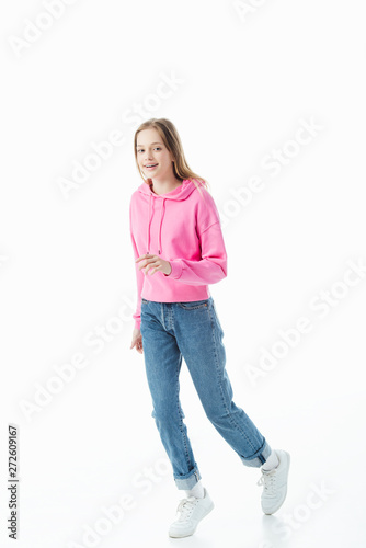 happy teenage girl in blue jeans and pink hoodie isolated on white
