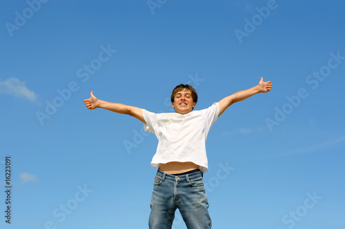 boy, teenage, teenage, jump, jumping, sky, wow, succeed, young, clear, blue, 1, happiness, freedom, outdoors, long, joy, cheerful, fun, male, isolated, facial, expression, summer, high, nature, action, flying, sunlight, clothing, sunshine, ecstatic, expressing, shirt, natural, arm, active, positivity, caucasian, hand, up, exclamation, jean, t-shirt, widener, out, smile, smiling