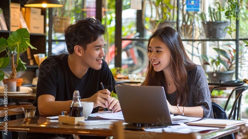 thai, couple, investment, planning, young, adult, discussion, happy, human relationships, goal, financial, future, cosy, hot drink, shop, laptop, notepad, teamwork, strategy, technology, diversity, asian, ethnicity, business, plan, literacy, entrepreneurship, love, bond, communication, aspiration, success, dream