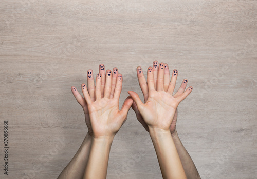 finger, girl, together, couple, man, woman, love, palm, family, hand, smile, wooden, texture, wall, background, happy, sky, cloud, drawn, relation, concept, young, signs, fun, symbol, male, people, female, person, idea, face, adult, expression, boy, happiness, woman, joy