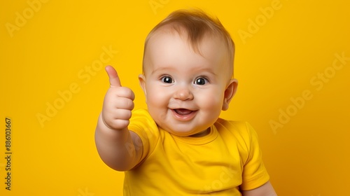 Happy toddler giving a thumbs up on bright yellow background, expressing positivity and approval