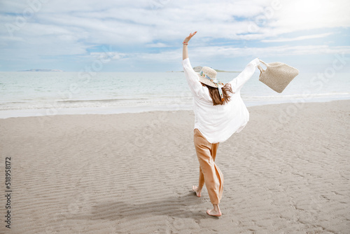 Happy traveler woman with straw hat walking and open arm on sea beach during vacation