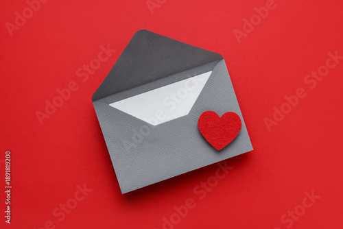Happy Valentine's day. Envelope with greeting card and decorative heart on red background, top view