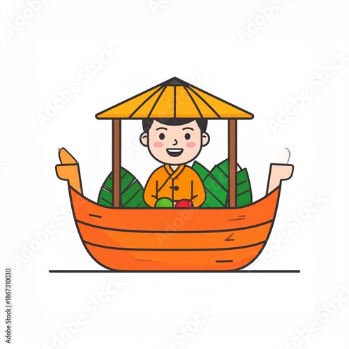 fisherman, wooden boat, leghorn, vietnamese, smiling, happy, traditional, cultural, lifestyle, coastal, illustration, cartoon, character, tea, relaxation, nature, water, river, sea, fishing, rural, peaceful, calm, serene, joyful, cheerful, vibrant, warm colors, orange, green, yellow, hand-drawn, vector, simple, minimalist, travel, tour tourism, culture, heritage, occupation, work, leisure, happiness, positivity, freedom, adventure, environment