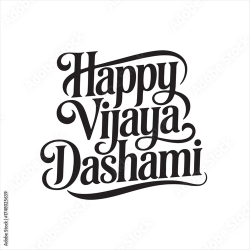 Happy Vijaya Dashami Lotus Calligraphy Design, Black and White Vijaya Dashami Greeting Vector, Elegant Lotus Flower with Happy Vijaya Dashami Text, Traditional Vijaya Dashami Festival Vector Art.