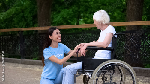 Happy volunteer smiling to senior woman sitting wheelchair, old people care