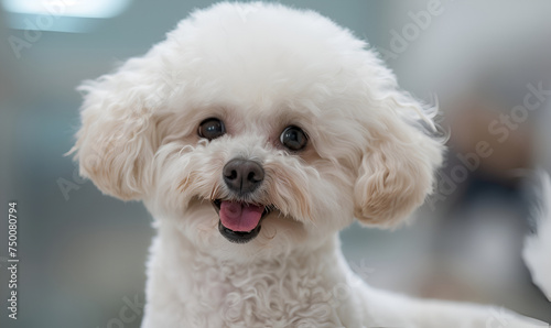 Happy white Bichon Frise enjoying grooming time, soft-focus background