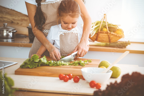 Happy woman and her daughter making healthy vegan salad and snacks for family feasting in sunny kitchen. Christmas, New year, Thanksgiving, Anniversary, Mothers Day. Healthy meal cooking concept