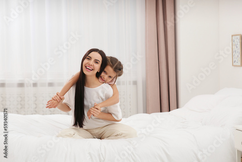 Happy woman and her daughter spending time together on bed at home, space for text. Mother's day celebration
