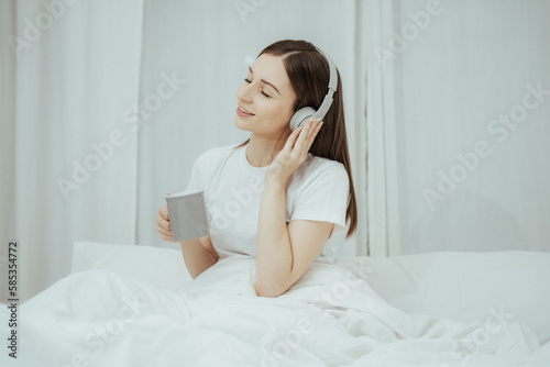 Happy woman holding apple and listening to music sitting on sofa in living room at home