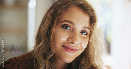 Happy woman, portrait and morning with self confidence or natural beauty in satisfaction at home. Face of young female person or freelancer with smile for positive attitude, style or future at house