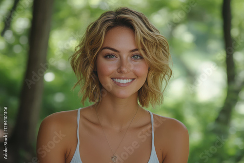 happy, woman, portrait, forest, background, copy, space, mood, natural, beautiful, female, person, model, smile, smiling, joy, happiness, green, tree, wood, nature, outdoors, bokeh, sunlight, light, sunshine, summer, spring, youth, young, adult, 30, beauty, elegant, pretty, face, head, shoulder, neck, hair, blond, eye, looking, calm