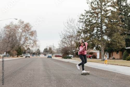 asphalt, attractive, brunette, casual attire, clothing, cool, cute, denim, exercise, fit, happiness, happy, helmet, home, house, jean, lifestyle, neighbourhood, outdoors, pant, ride, road, skateboard, skateboarder, skateboarding, skater, smile, smiling, sport, sport, street, suburb, suburban, sweatshirt, tree, woman