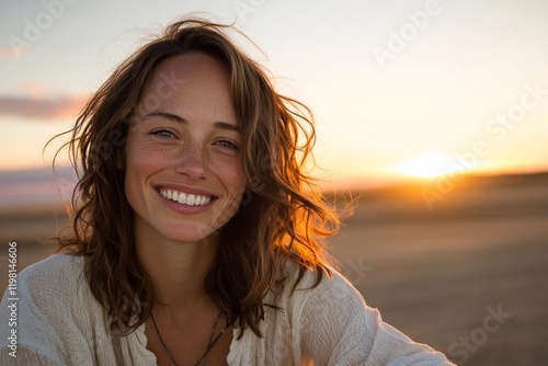 sunset, woman, smile, happiness, curly hair, tranquil, landscape, joyful, golden hour, serene, outdoors, nature, beauty, carefree, posing, sunlight, relaxation, evening, calm, expression, freedom, lifestyle, connection, emotion, earth-tone, bliss, casual attire, bright, peaceful, warmth, portrait, body language, glowing, setting sun, atmosphere, adventure, oneness